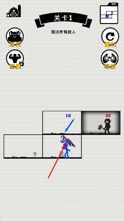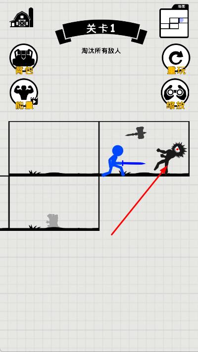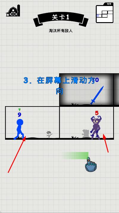 1、进入界面,点击开始按钮,进入关卡1,根据提示在屏幕上滑动方向,通过在屏幕上滑动,控制蓝色火柴人角色移动方向,靠近敌人进行攻击。