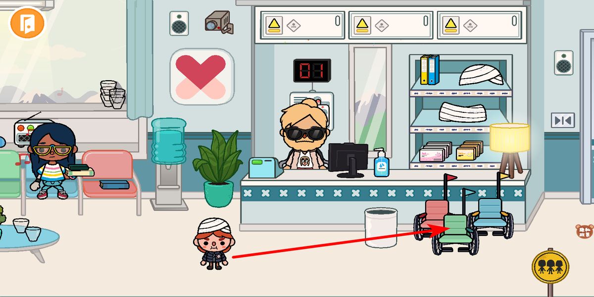 2、大厅里你会看到受伤的病人,比如头上缠着绷带的人,看到轮椅后,点击轮椅,受伤的病人就会自己坐到轮椅上,方便你将他们送到对应的诊疗区域进行治疗。