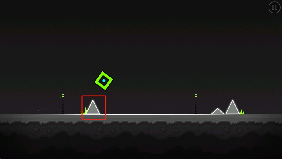 2、遇到白色三角障碍时,精准把握跳跃时机,让方块在空中调整位置,顺利越过障碍,注意躲避两侧绿色光点旁的黑色立柱。