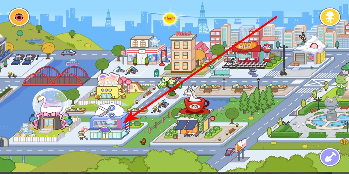 2、进入游戏主界面后,会看到一个丰富多样的城市场景,其中有一个造型独特的美发店建筑,点击它就可以进入美发店,开启美发相关的游戏体验。