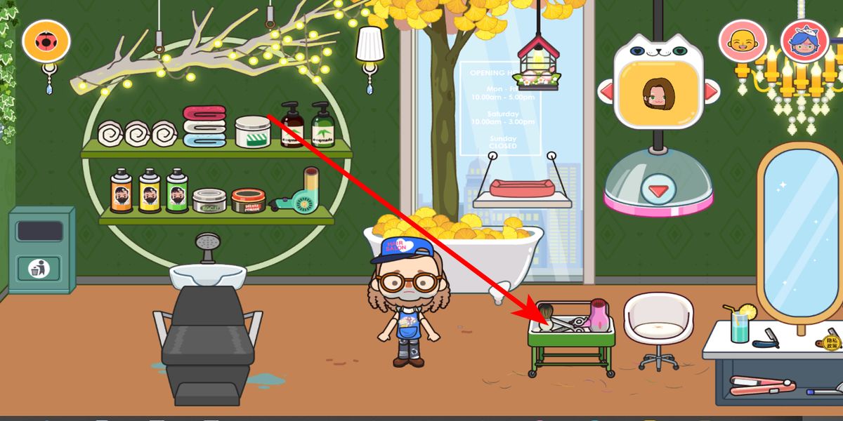 3、美发店场景内,有一个摆放着各种美发工具的小推车,点击这个小推车,就可以从中选取合适的美发工具,为角色进行美发操作,打造独特造型。