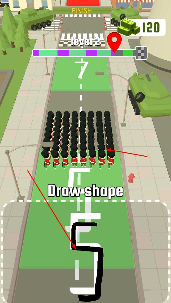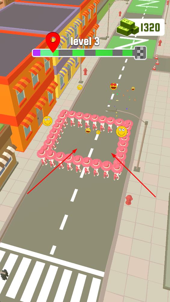 2、在道路上,人群将按照绘制的形状排列移动,避开障碍持续推进,为抵达终点奠定基础。