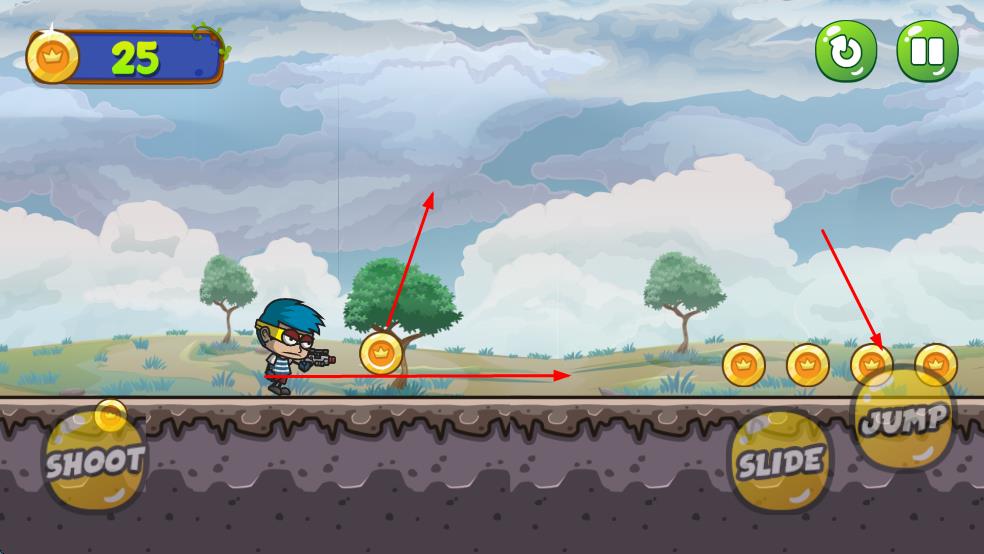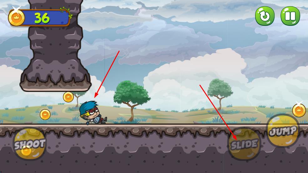 2、点击右下角SLIDE按钮触发滑铲动作,顺利通过障碍区域;遇到高处金币或障碍,点击JUMP按钮让角色跳跃。