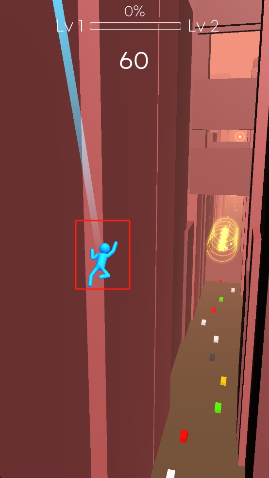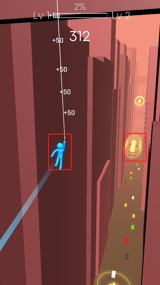 2、攀爬中留意右侧金色光圈目标,借助画面中+50标识的增益区域,调整火柴人位置,让其沿光线轨迹精准攀爬。