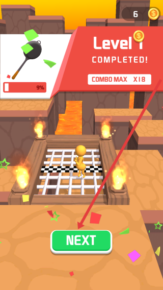 3、Level-1通关后,点击绿色NEXT按钮进入下一关,查看COMBO-MAX×18成绩,获取奖励,继续在火焰世界展开新冒险。