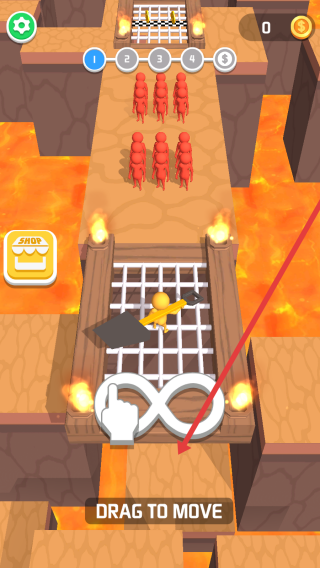 1、在火焰场景起始网格处,拖动黄色角色移动,跨越火坑,直面前方红色敌人队列,借拖拽规划路径,开启关卡战斗,为迎击对手做准备。