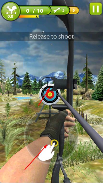 2、在场景中,通过触摸屏幕控制角色拉弓瞄准,调整瞄准角度和力度,瞄准靶心位置。