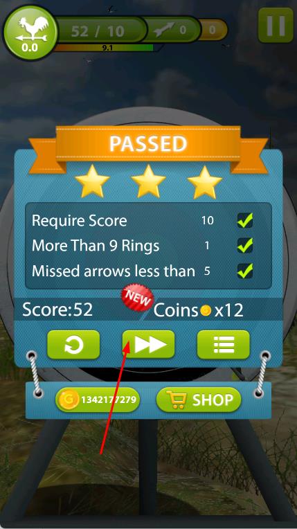 3、瞄准好后,释放手指发射箭矢,命中环数获得分数,成功完成关卡任务后,点击继续按钮进入下一个关卡。
