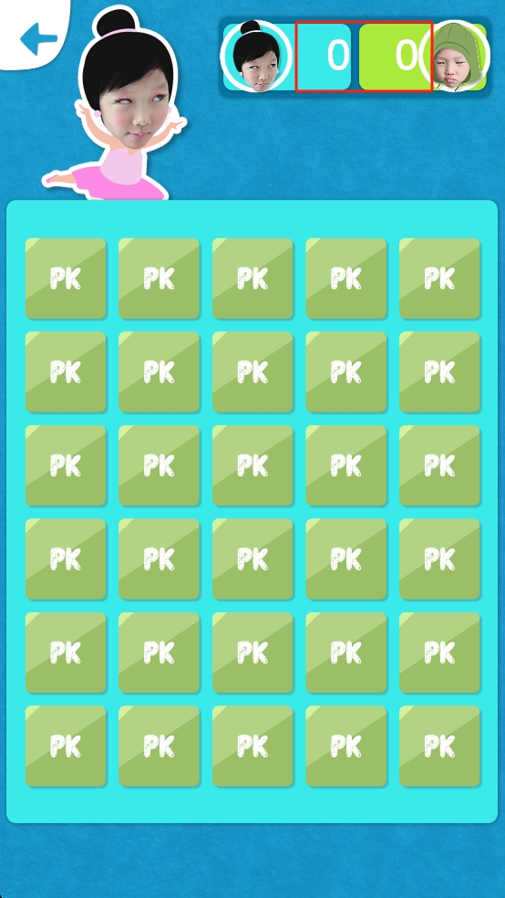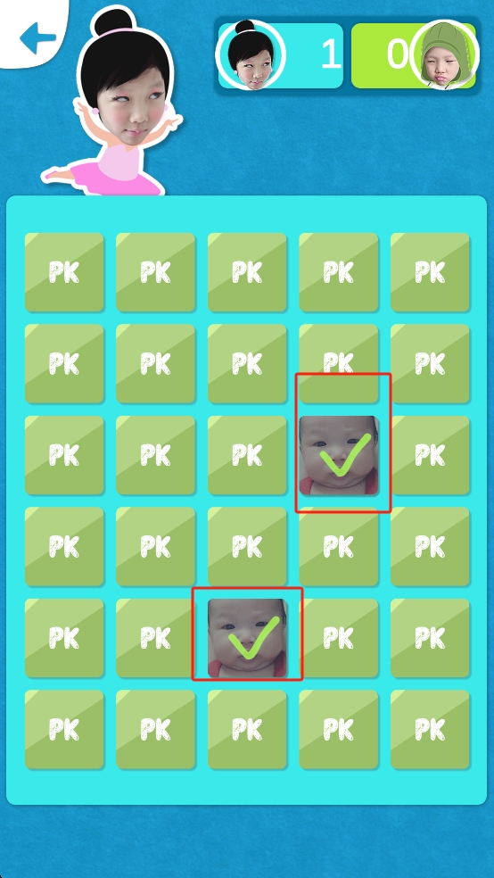 1、开局观察牌面布局,点击绿色的PK方块,翻开牌面寻找相同头像,快速记忆位置,为后续配对做准备。