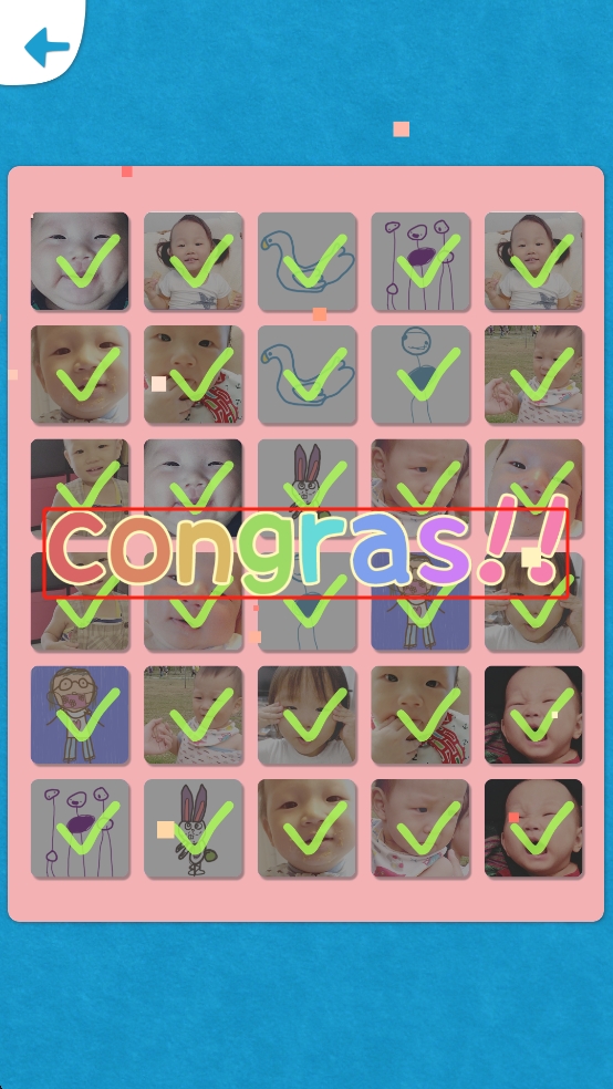 3、当所有牌面都配对成功,界面显示Congras,就算完成本关,可进入下一轮挑战新的记忆配对关卡。