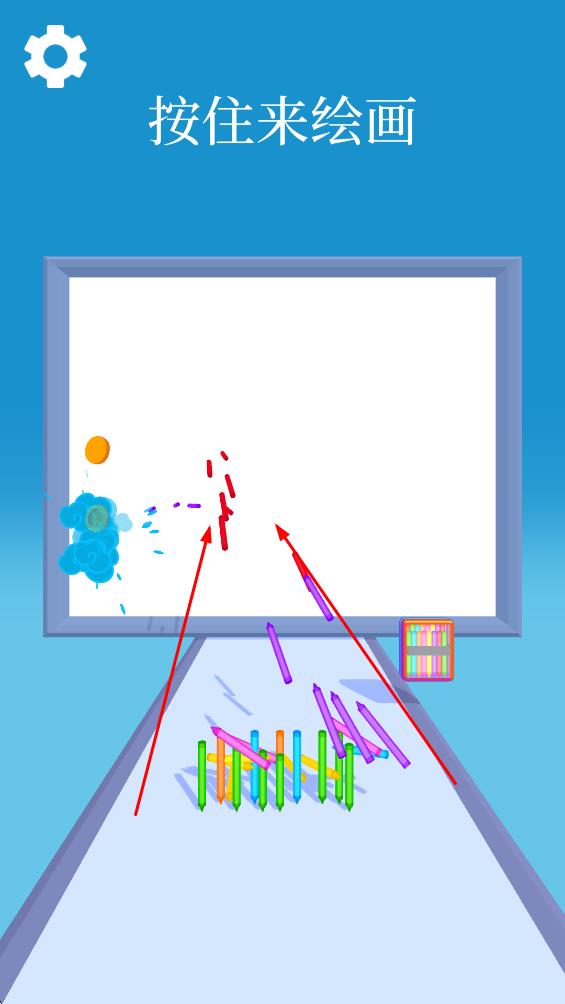 3、到达绘画区域时,按照“按住来绘画”提示操作,利用收集的彩色铅笔在画板上创作,完成关卡任务。