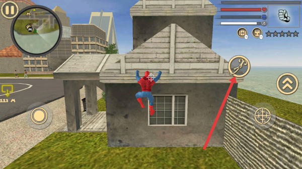 3、靠近建筑时点击对应按钮,利用蜘蛛侠爬墙能力攀爬墙壁,登上屋顶观察环境或推进任务,发挥英雄独特移动方式穿梭城市。