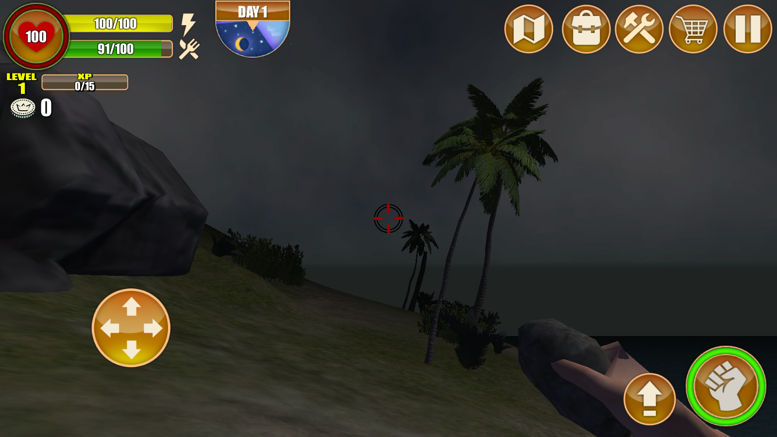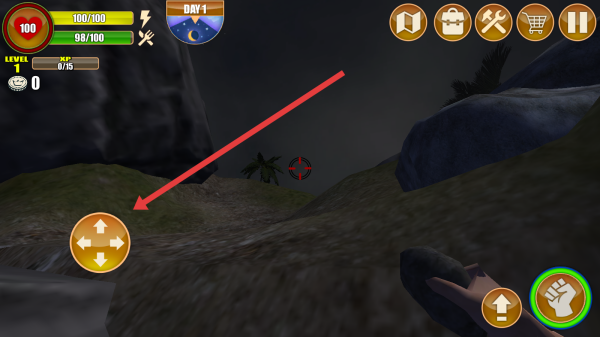 2、游戏内通过左侧十字方向键操控角色移动,在岛屿地形穿梭,寻找物资或安全区域,熟悉生存环境探索方式。