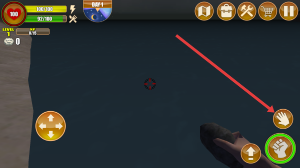 3、发现水源区域时,点击右侧手掌图标,搜集水源,补充生存必需水资源,保障角色存活,推进Day1生存进程。