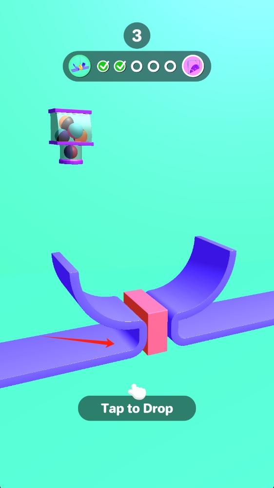 3、进入第3关,仔细观察场景,点击Tap-to-Drop使球体下落,巧妙应对红色障碍物,推进关卡进度。
