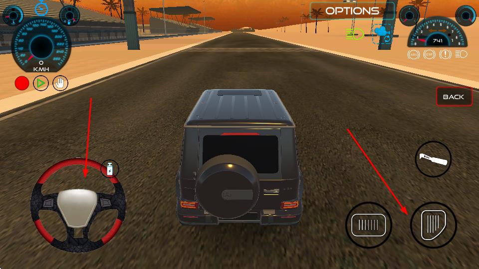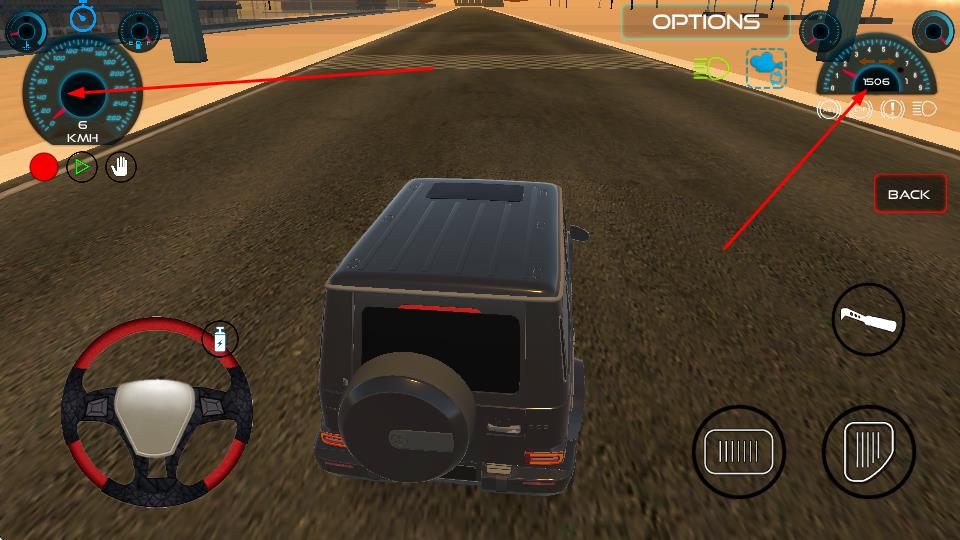 2、在驾驶界面通过左侧虚拟方向盘控制车辆转向,右侧按键分别操控油门加速与刹车减速,同时观察仪表盘监测速度、转速等数据。