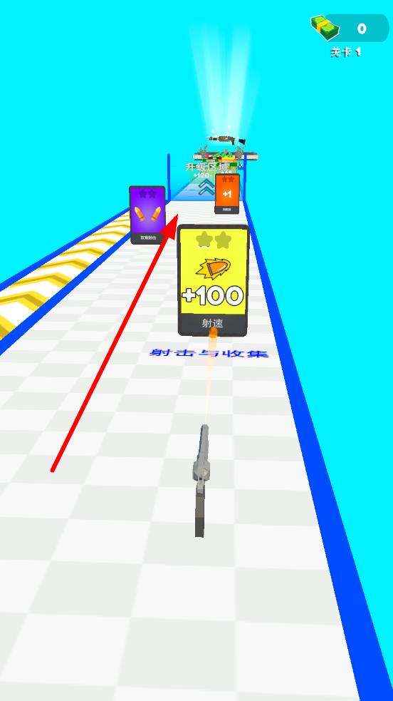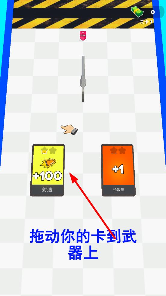 1、进入关卡,枪械自动前进,跑道出现增益卡,滑动枪械进行射击,卡片会进入左侧的滑道中,可持续收集增益卡。
