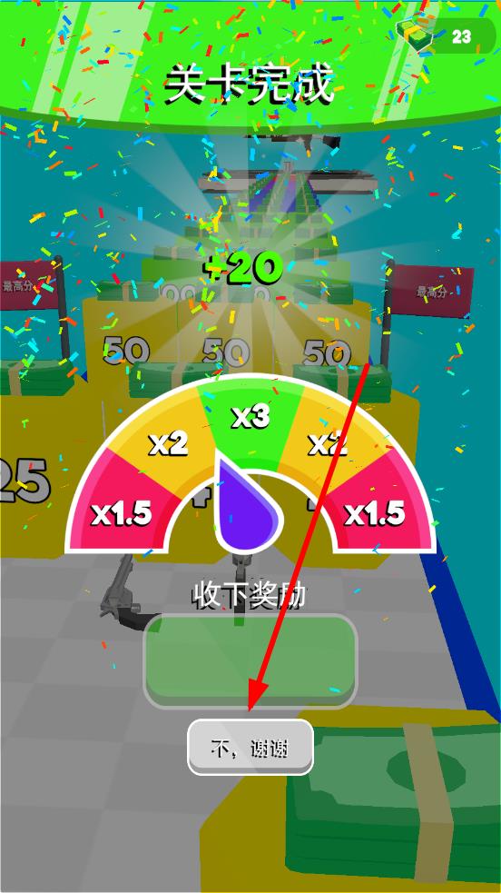 3、抵达终点触发关卡完成结算,指针转动决定奖励倍数,点击收下奖励可获倍数金币需看广告,金币可以用于解锁新枪械。