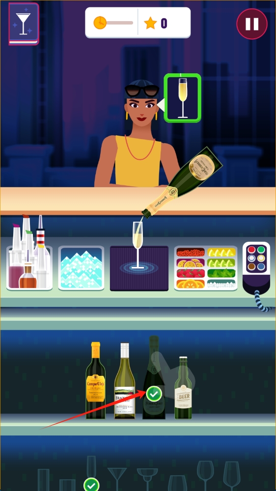 3、在游戏场景,根据顾客需求,从酒架选择对应酒品,精准调制饮品,提升顾客满意度。