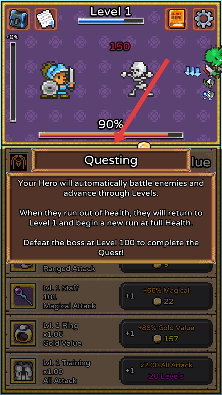 1、了解Questing机制,英雄自动战斗推进关卡,死亡返回Level1并满状态重启,击败Level100的boss完成任务。