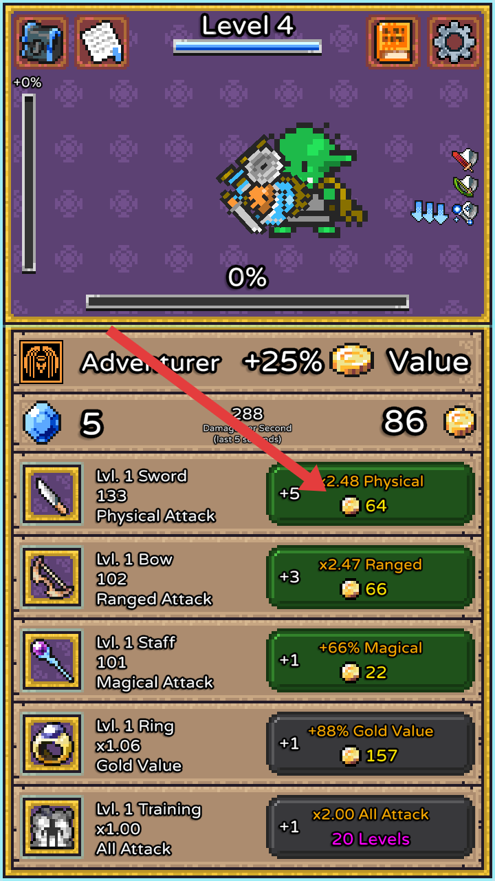 3、可以消耗金币升级装备如Lv1Sword,提升物理攻击等属性,增强角色战斗能力,应对更高等级的怪物。