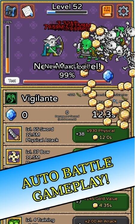 simple rpg融合挂机放置模式,通过培养与收集逐步强化英雄角色,在角色扮演任务中,需化身空闲点击英雄打击可怕怪物,没有退路只能前进,既可选择空闲等待,也能通过点击操作战胜怪物,自动战斗机制带来增量式进步,直截了当的战略升级与复古像素艺术交织,还有意想不到的玩法曲折,带来独特的角色扮演乐趣。