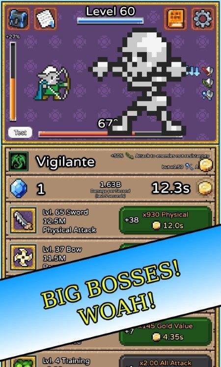 2、敌人种类丰富:敌人涵盖术士、食人魔、地精、龙等多种怪物,还有史诗级老板等待挑战,需升级英雄或疯狂点击才能克服,多样敌人让战斗始终充满新鲜感。