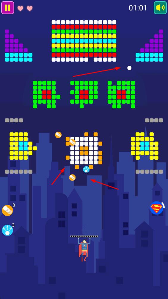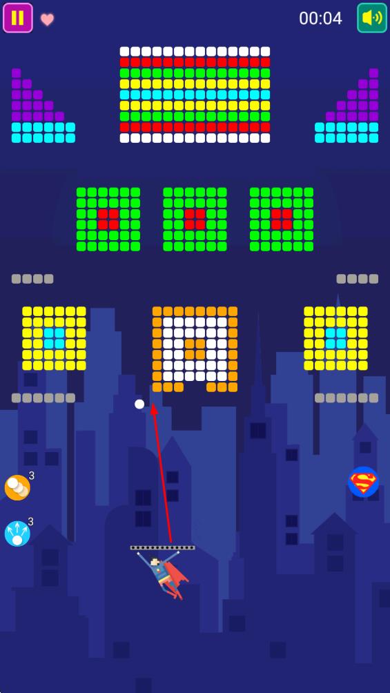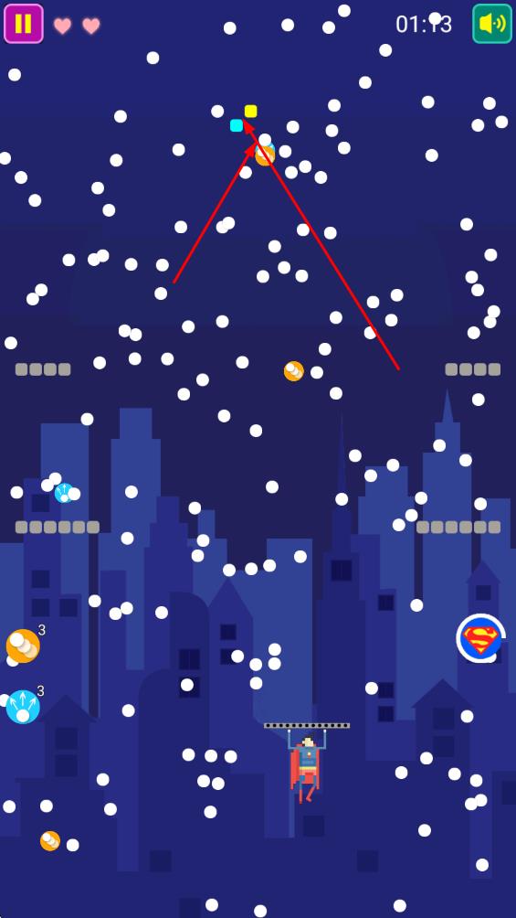 1、操控超人发射球体,瞄准上方彩色方块,这是开启消除挑战的关键操作,推动游戏进程。