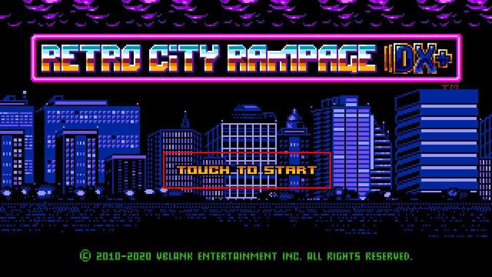 1、画面中RETRO CITY RAMPAGE DX+标题下,点击橙色TOUCH TO START交互区域,正式踏入充满荒诞与破坏的城市冒险世界。