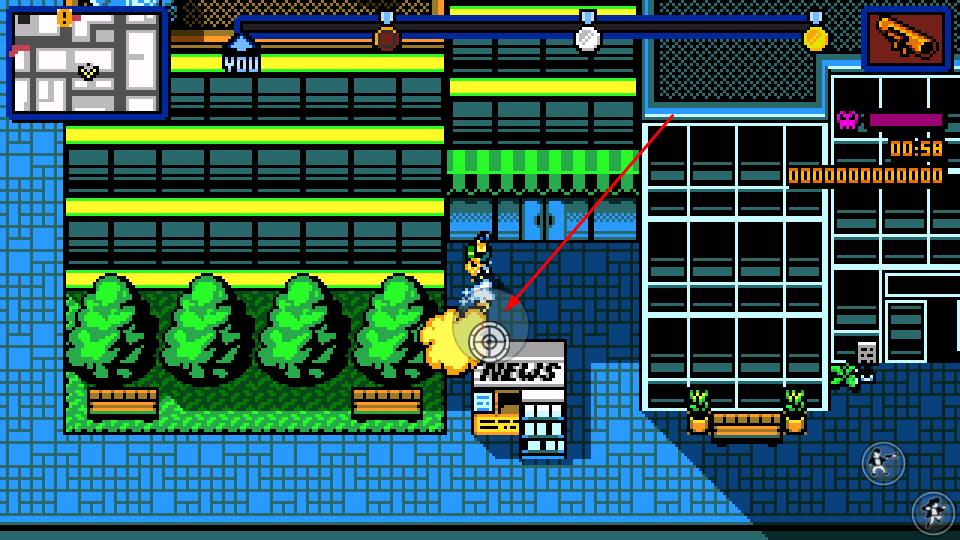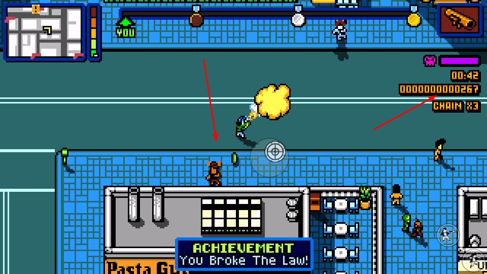 2、通过虚拟摇杆操控角色移动,点击右侧射击按键向建筑、行人等目标发起攻击,同时留意左上角地图指引与右上角时间、分数面板,规划破坏路线。