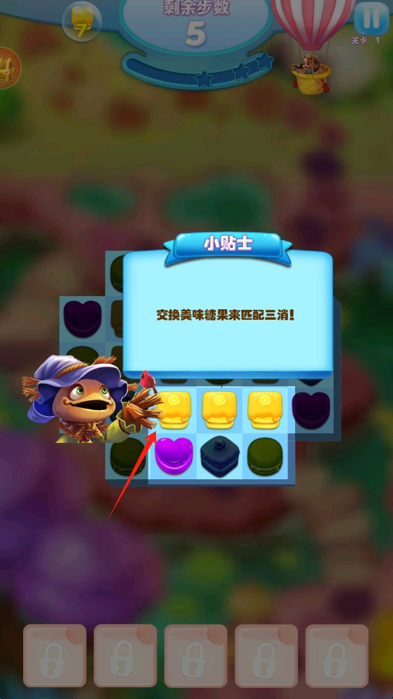 2、进入关卡界面后,观察糖果布局,通过交换相邻糖果的位置,让三个或三个以上相同的糖果连成一线。
