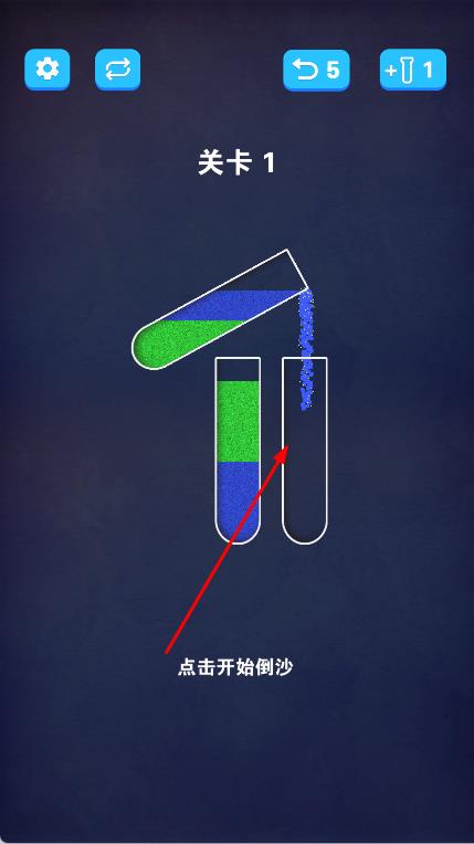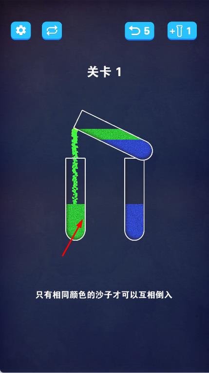 2、在游戏场景中,根据提示点击装有沙子的试管,将相同颜色的沙子倒入对应的空试管中,注意只有相同颜色的沙子才可以互相倒入。