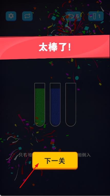3、成功将所有相同颜色的沙子分类到对应的试管中后,完成关卡任务,点击下一关按钮进入下一个关卡,继续挑战。