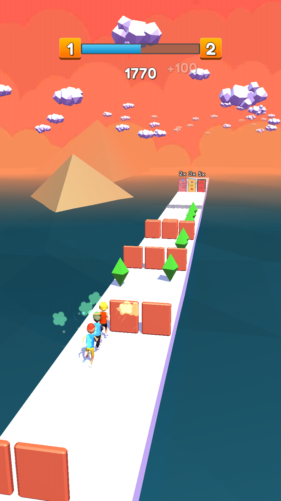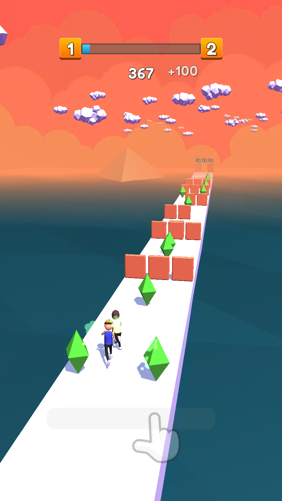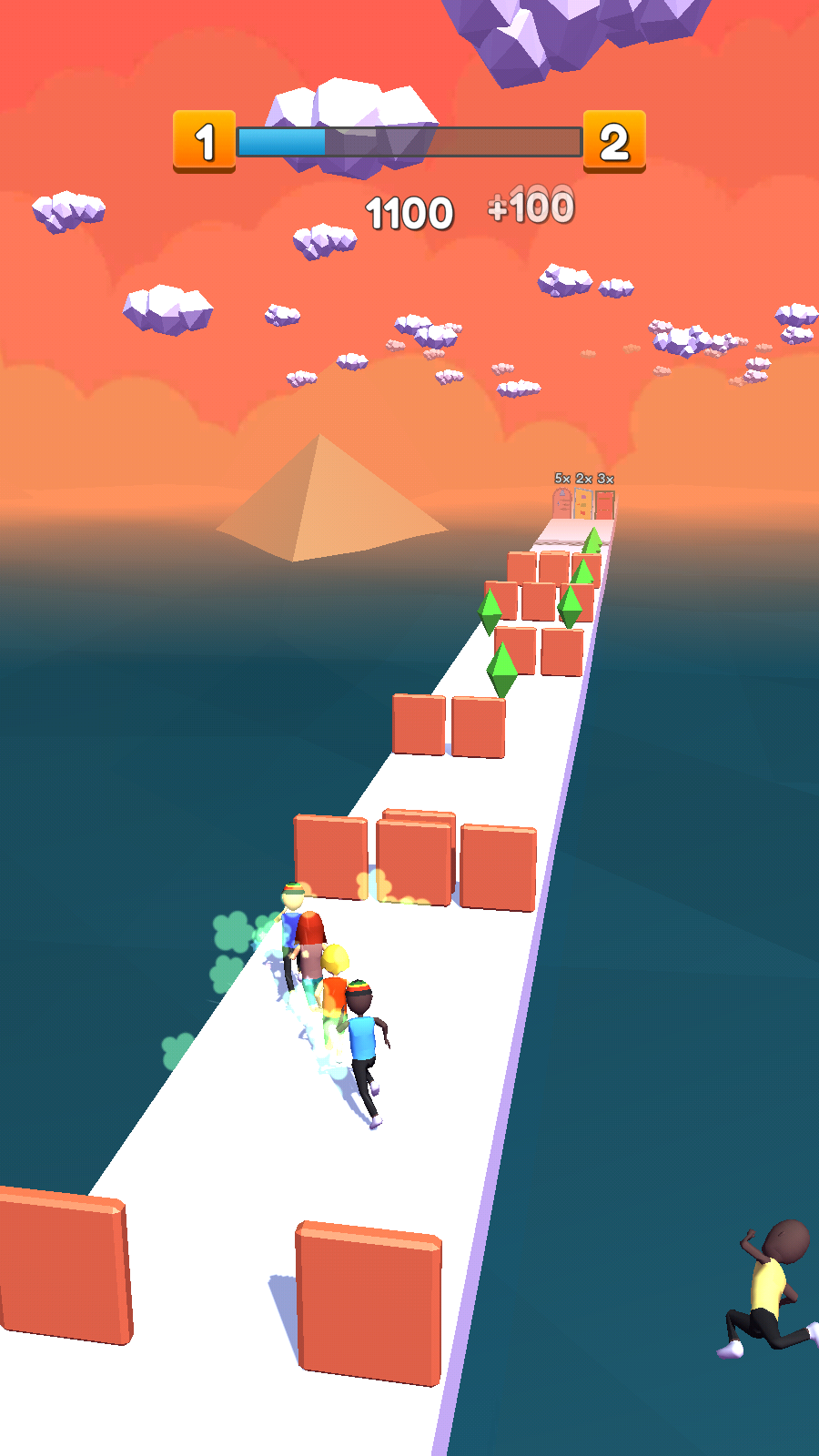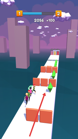2、跑酷途中拾取绿色水晶,扩充队伍人数,借人数优势跨越障碍,积累分数,推进关卡进程。