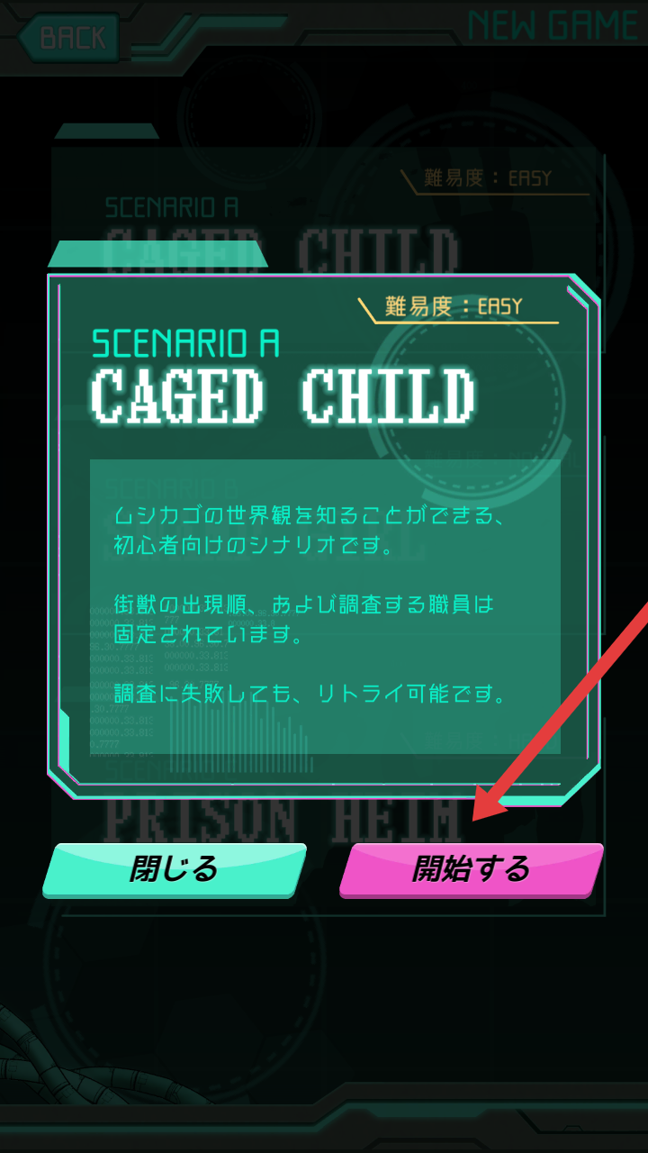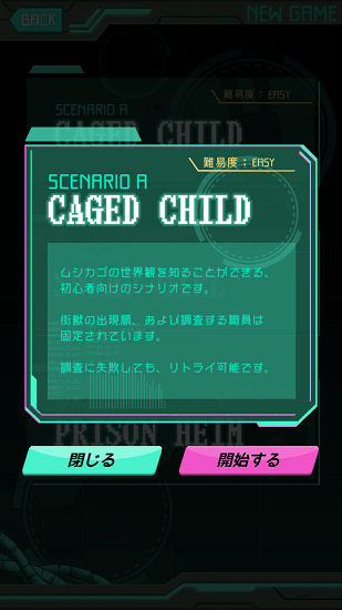 1、选择SCENARIO A CAGED CHILD剧本,難易度EASY,点击開始する,开启新手友好的剧情冒险。