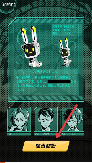 3、查看機器人MKG-001情報后,点击調査開始,启动機器人对下面的三个嫌疑人进行調查任務。