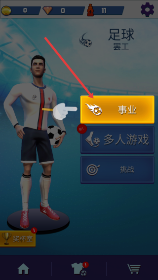 1、在游戏主界面,点击醒目的事业按钮,进入事业模式,开启你的足球事业挑战,开启足球事业相关的游戏内容。