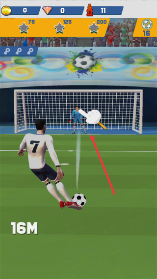 3、在射门环节,根据游戏提示,滑动屏幕控制足球的射门方向和力度,精准地将足球射向球门,争取顺利进球。