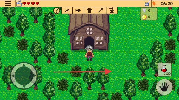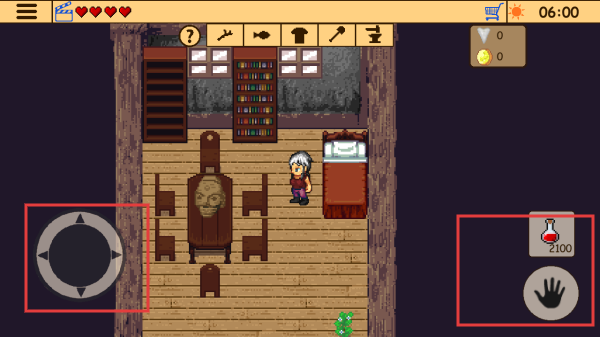 2、左侧圆形方向键可控制角色移动方向,右侧手掌图标可与场景中的物品进行互动,药水瓶图标可使用药品恢复生命值。