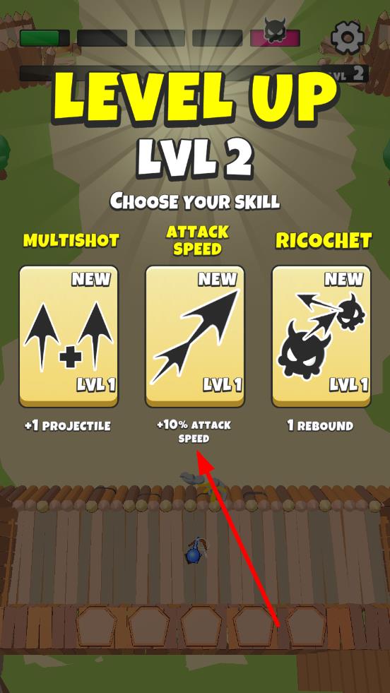 2、经验条满触发升级,三选一技能,多箭增弹射数量、攻速提射击频率、弹射让箭矢反弹,按照当前所面对的敌人密度抉择。
