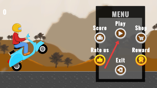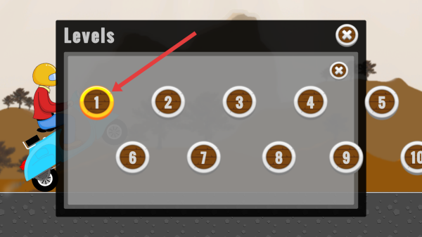 3、通过箭头的指示,点击Levels界面的数字1关卡,开启摩托车闯关挑战,在地形中骑行冒险。