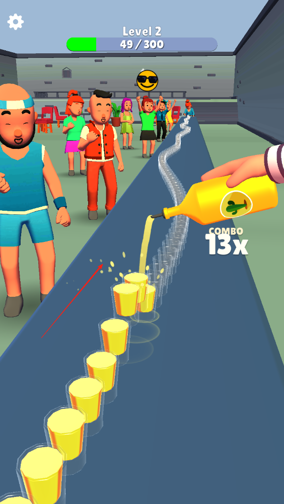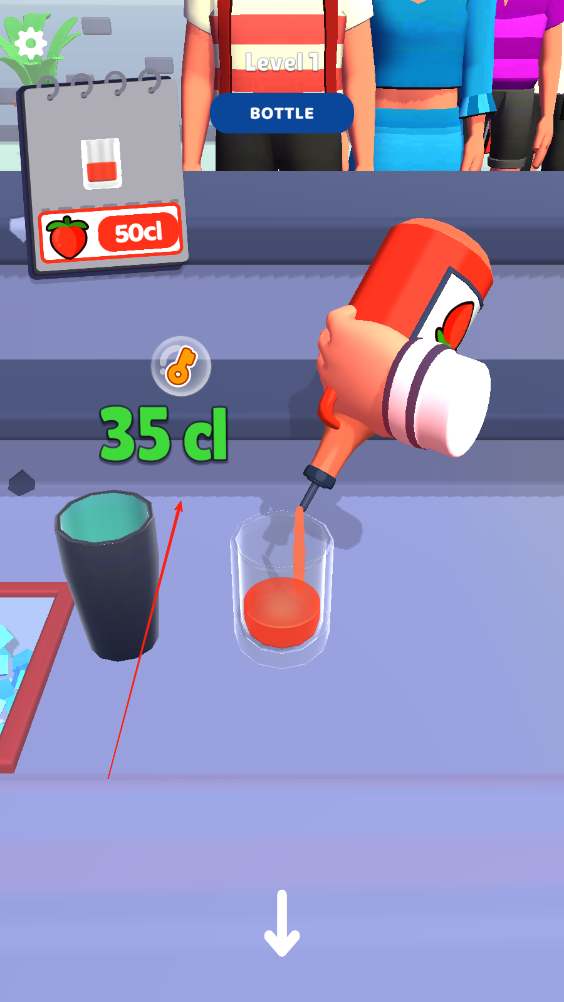2、拖动上方的酒瓶,将前方的空杯子倒满,最上方有数量要求,要注意及时左右移动酒瓶。