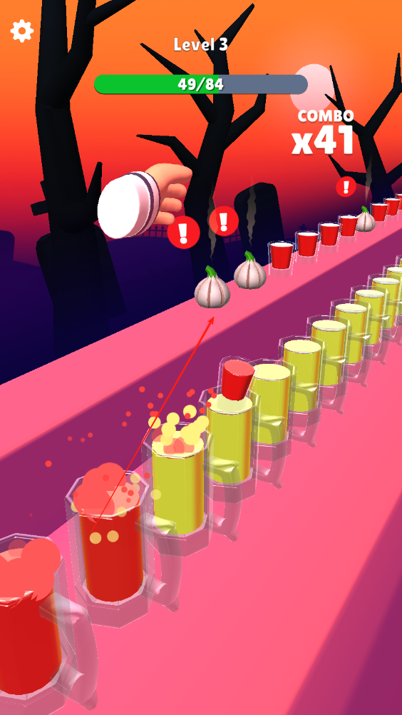 3、这一关卡需要将上方的饮品推进酒杯里,点击屏幕即可推动酒瓶,要注意不要将蒜推到酒里。