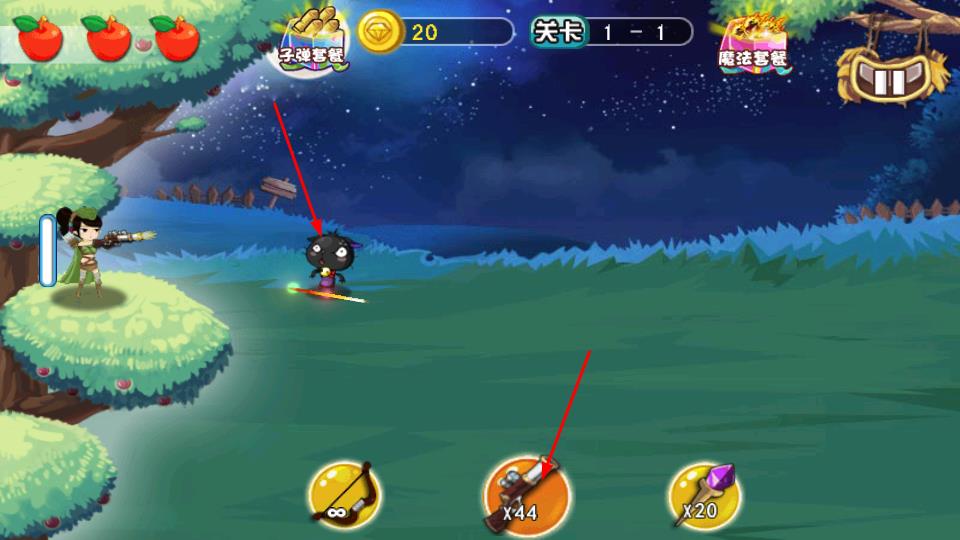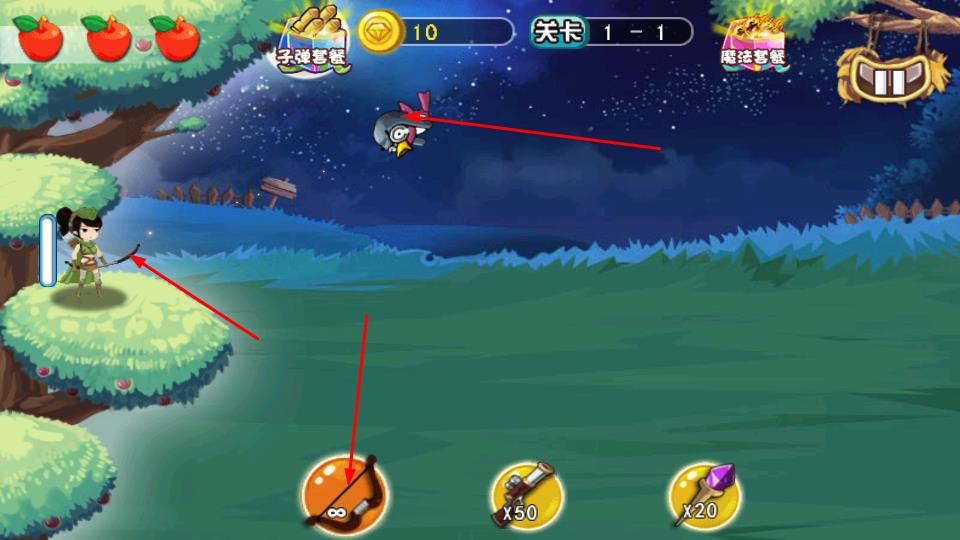 2、切换底部弓箭、刀剑、魔法武器,选定后点击释放攻击,弓箭瞄准飞行敌人,刀剑近战迎敌,魔法远程轰击。