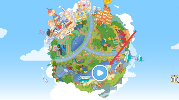 1、点击星球中央的播放按钮,进入满是建筑与场景的卡通世界,开启互动探索冒险,邂逅多样场景与角色,解锁趣味玩法。