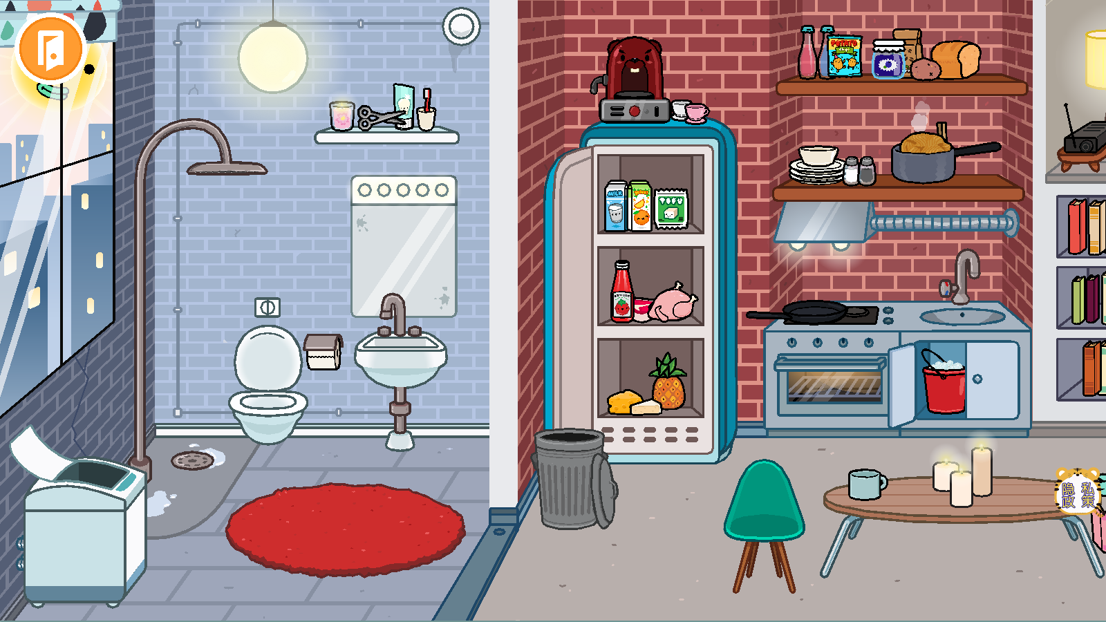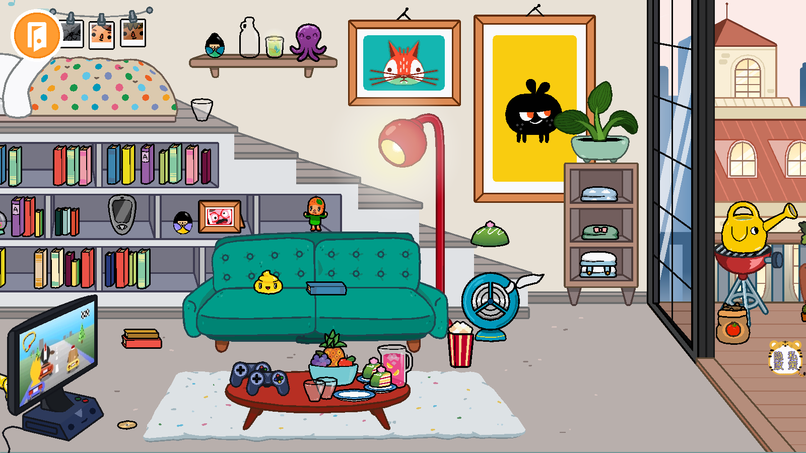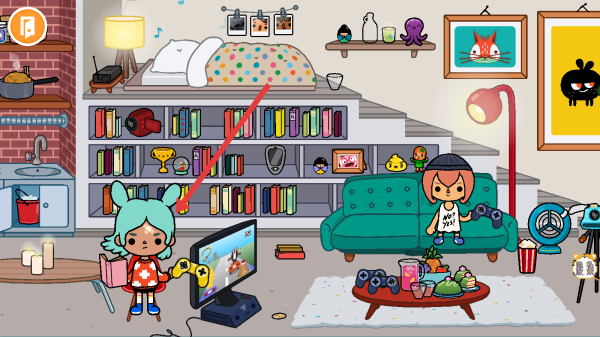 2、在室内场景中,拖动角色如左侧拿书女孩,与电视、书架等物品互动,触发趣味玩法,体验角色与环境的互动乐趣,推进进程。