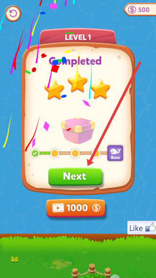 3、Level-1通关后,点击界面中间绿色Next按钮,领取三星奖励与宝箱,继续挑战后续关卡,推进游戏进程。