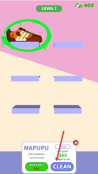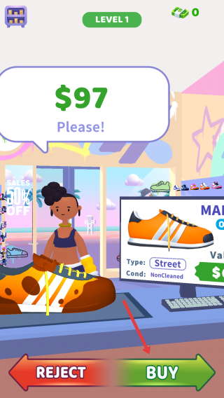 1、当看到标价为$97的鞋子时,根据游戏提示,点击BUY按钮,完成鞋子的购买操作,开启后续的清洁处理流程。