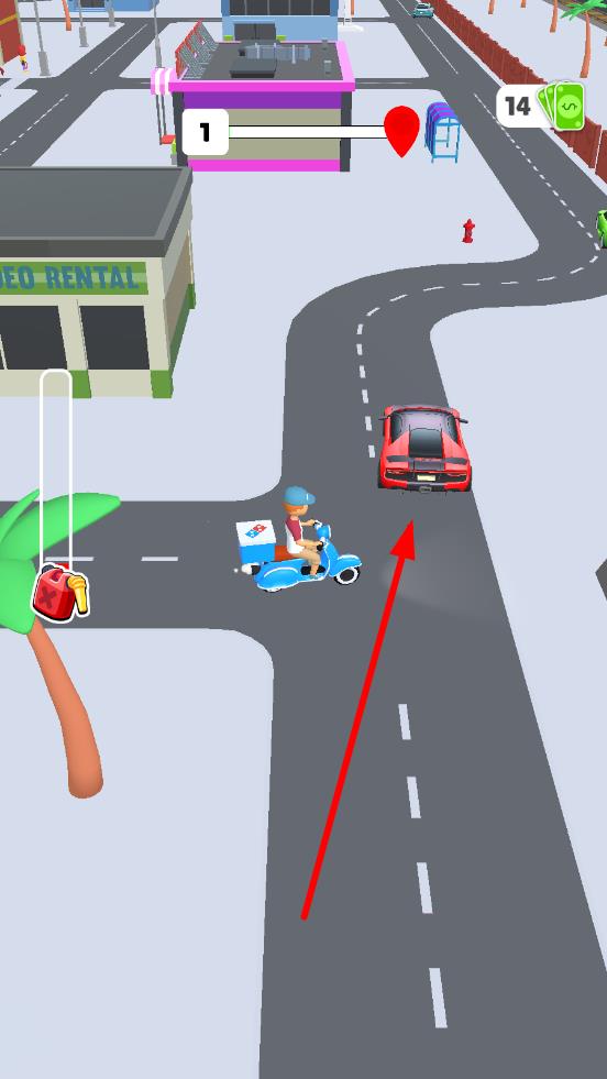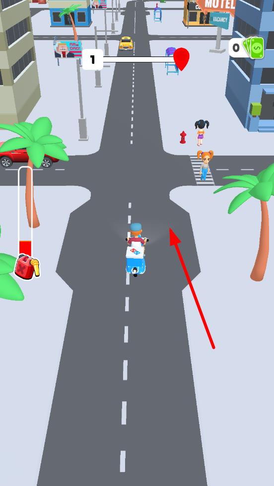 1、进入关卡,操控车辆朝红心目标行驶,查看左侧的油量条,在路口时候,需要避开车流,等斑马线行人通过,保持方向稳定,规划首段送货路线。