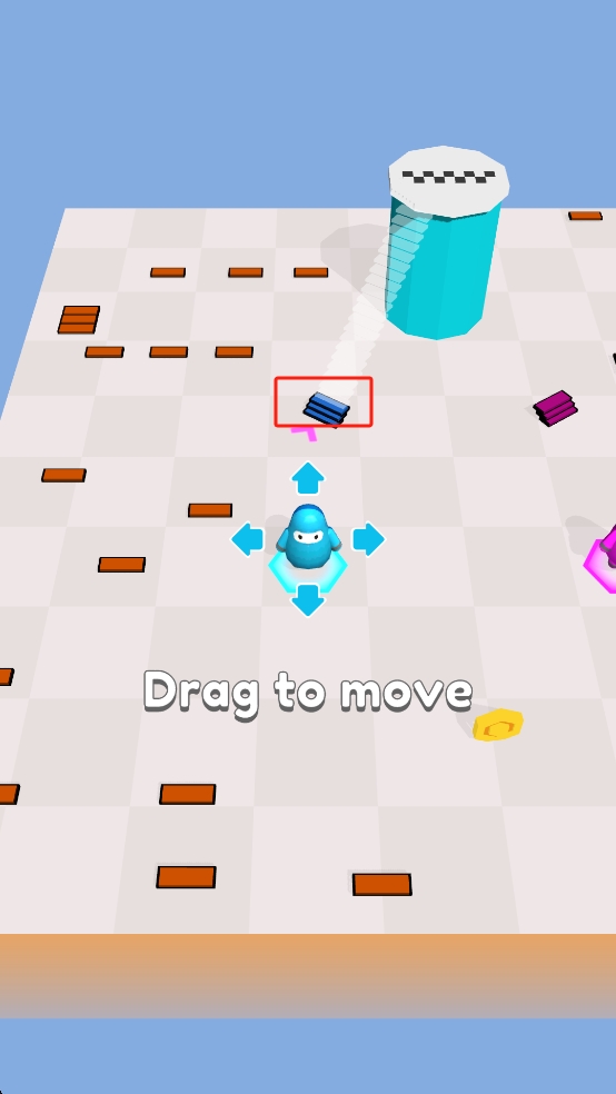 1、拖动蓝色角色,朝蓝色堆叠方块方向移动,根据下方的提示进行操作,收集该方块,注意避开场景中其他障碍。
